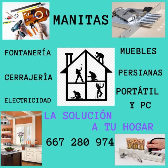 MANITASColgar cualquier elemento a la pared (tv, cuadros, espejos, percheros, lámparas, rieles, estanterías, cortinas, estores, mosquiteras, baldas, tendederos o cuerdas). Persianas, montajes de muebles (Ikea, Leroy Merlin, otros), telefonillos, tirador de la puerta, ventiladores de techo, engrasar bisagras, burletes, puertas y barras de armarios, accesorios de cuarto de baño. Sellado con silicona (bañera, ducha, lavabo, fregadero, otros).